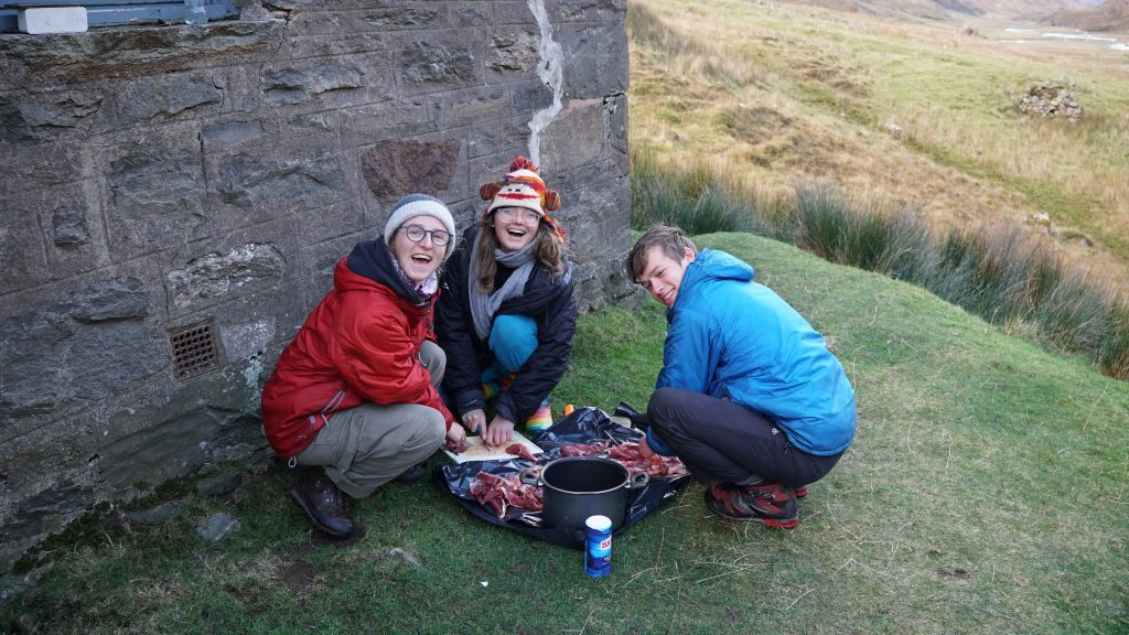 While we chopped and chatted, I considered the small matter of what to braise it in. I had wrongly assumed that someone would have some sort of wine going spare, but I should have known better – there was nothing except a few dregs of convenience store spirits leftover. I then moved on to the next challenge and asked whether anyone had any onions. Luckily, Robbie had three big juicy ones in his van, along with some flour, all of which I was welcome to pilfer in exchange for first dibs on the stew. Happily, the bothy also comes equipped with a gas stove and basic seasonings including all manner of dried herbs, stock cubes and black pepper, so really, all we were missing was the wine I was so confident we could scrounge off someone. I spent the next few minutes sniffing half-empty bottles of spirits and then decided that Glen’s Vodka and Famous Grouse were not suitable to accompany such a mighty and delicious hunk of venison. Then I remembered my herbs in my rucksack, and upon fetching those, came to acknowledge that despite a lack of wine or vegetables, we still had the making of a great feast before us.