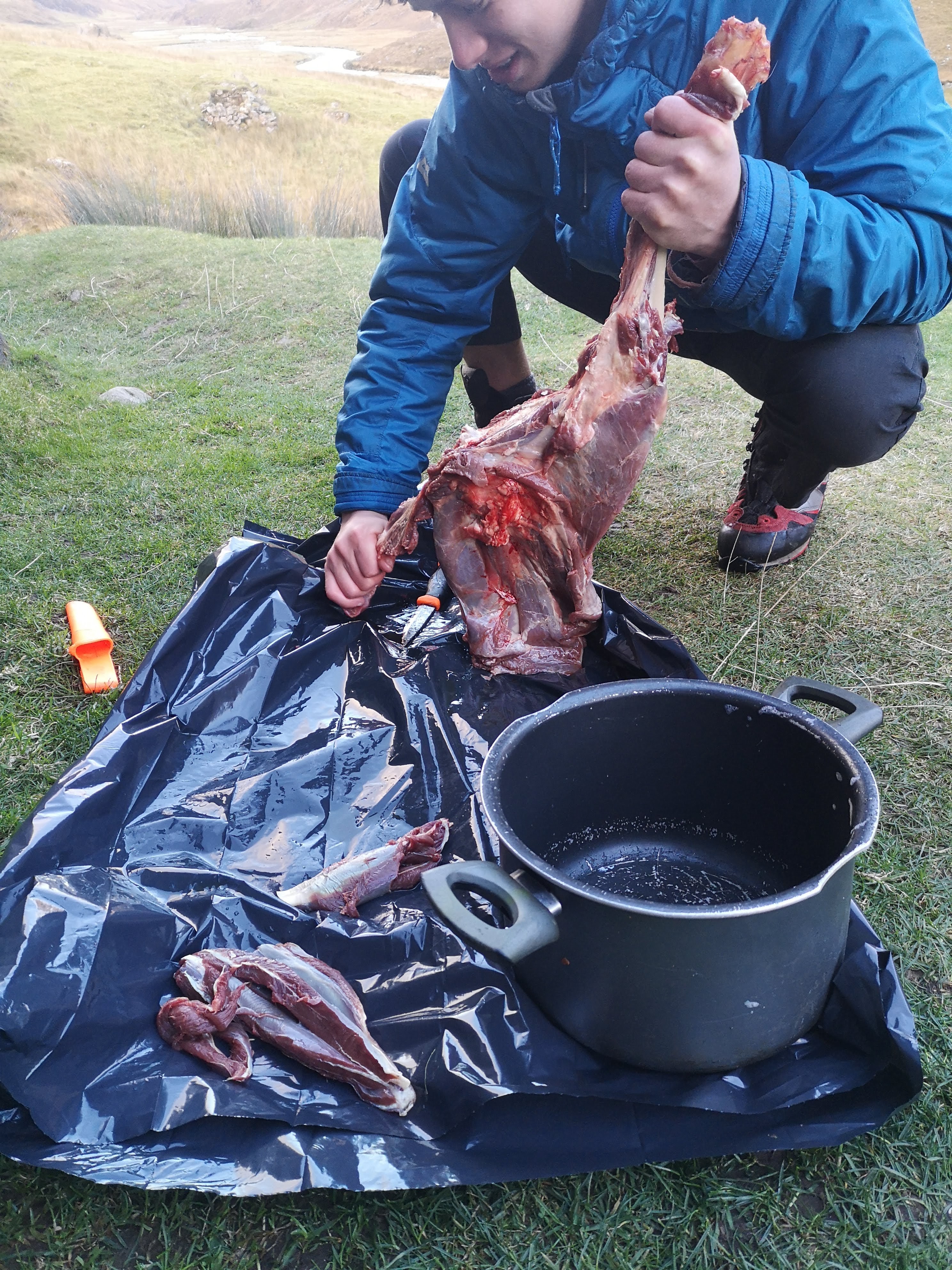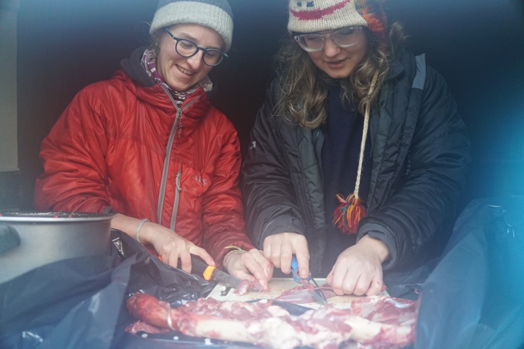 After she told me all that that, I excitedly asked Soph to show me the goods. Sure enough, she went outside and returned with the large dry-bag containing 6-7kg of deer leg, plus at least 600g of loin. At this point, it was around 6pm, and we were surrounded by increasingly rowdy EUMC members, so we decided to put the idea of making stew aside for that evening, and instead attempt it all in the morning. That way there would be daylight rather than torch-light, and no one would fall over and give themselves third degree burns on a vat of venison casserole bubbling away into the small hours.