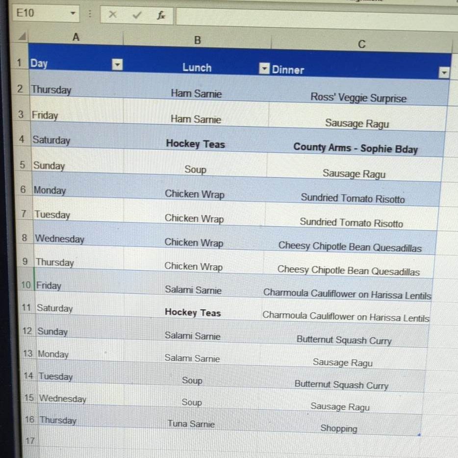Yes, those are his lunches mapped out just there next to his dinners. Chicken wraps Monday through Thursday, and a little salami sandwich on Friday, as a treat. He also knows where and when he’s eating out that week because most of his friends are also 9-5 folks – so into the spreadsheet it goes. Unsurprisingly at this level of organisation, Fred plans his food shops in advance and goes for a big one every two weeks, having taken stock of what he’s already got in the cupboards. He even writes down which aisles to visit first in order to spend as little time, and therefore money, in the supermarket as possible.